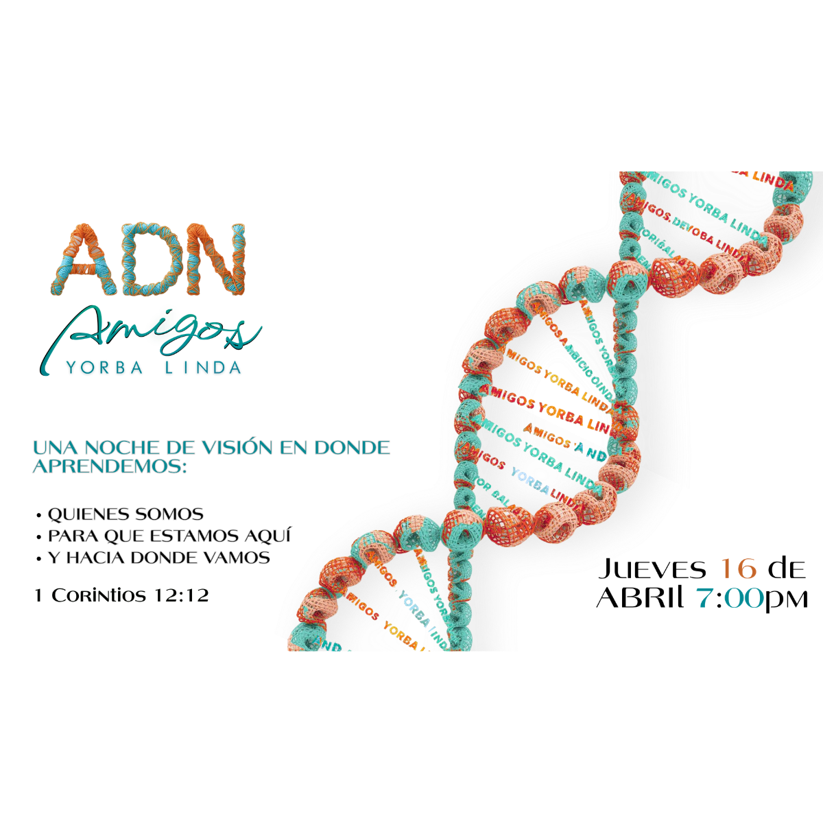 ¿Eres parte del equipo o quieres serlo? ADN es nuestra noche de visión para líderes, voluntarios y todos los que tienen el deseo de servir. Descubre quiénes somos, por qué hacemos lo que hacemos y hacia dónde vamos… ¡y sé parte de lo que Dios está haciendo en Amigos! 🗓️ Jueves 16 de abril | 🕖 7:00 PM 📍 En la capilla 🍽️ Tendremos cena tipo potluck, así que trae algo práctico y sencillo para compartir con los demás. ¡Será una gran noche de comunidad y visión!