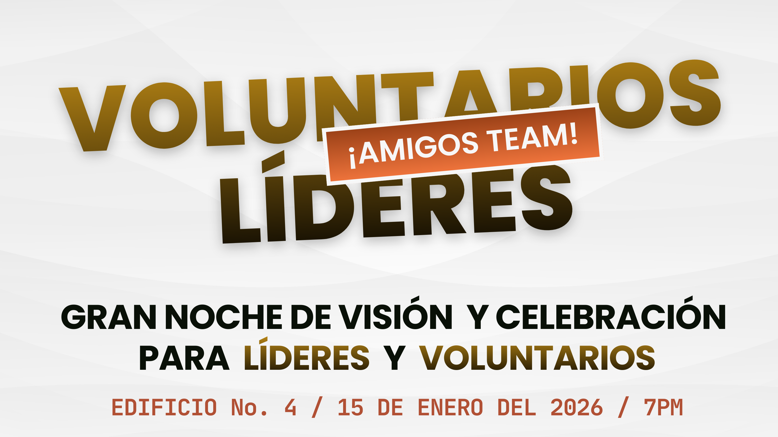Este jueves 15 de enero a las 7:00 pm, te invitamos a una noche muy especial en el Edificio 4, dedicada a honrar y celebrar a nuestros líderes y voluntarios. Disfrutaremos de comida, música y un tiempo de reconocimiento, y además nuestro pastor compartirá la visión y dirección de la iglesia para el próximo año. ¡No te lo pierdas—será una noche para celebrar lo que Dios ha hecho y soñar juntos con lo que viene!
