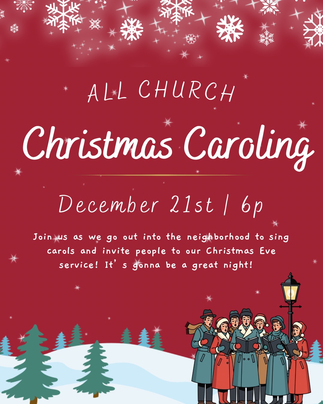 You’re invited to join us for Christmas Caroling! Help us share the joy of Christmas with the neighborhood around our church! We will be going door-to-door caroling and inviting our community to our Christmas Eve Service, and we’d love for you to be part of it. We’ll sing classic Christmas carols and hand out invites. Looking forward to seeing you on Sunday, 12/21 at 6 pm at church! Dress warm!